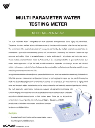 The ACM-MP-551 is a multi-parameter water testing meter designed for high accuracy in measuring pH, ion concentration, conductivity, and dissolved oxygen across six parameters. It features automated temperature compensation, a data storage capacity of 300 samples, and is compliant with GLP standards, making it suitable for laboratories and research settings. The device includes various electrodes and software for data logging, enhancing its utility in analytical applications.