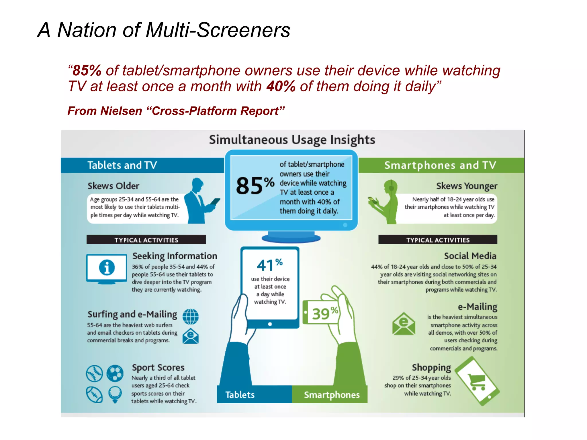 The document discusses the rise of multi-screen viewing behaviors and the opportunities this presents for developing second screen applications that enhance the TV viewing experience. It provides examples of existing second screen apps that offer social features, games, information lookup, shopping and more to engage viewers. New technologies like automatic content recognition, voice interaction, and communication across devices are enabling more continuous and personalized multi-screen experiences.