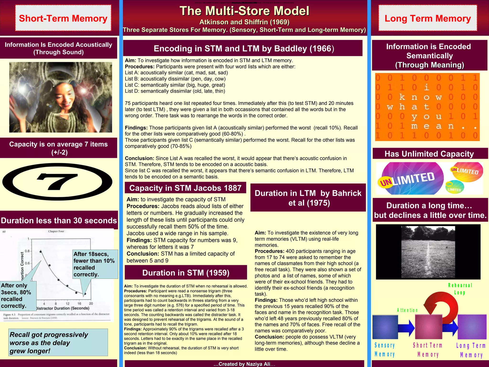 The document summarizes several studies investigating short-term memory (STM) and long-term memory (LTM). One study found that lists of words that were acoustically or semantically similar were recalled worst from STM and LTM respectively, suggesting STM encodes information based on sound and LTM based on meaning. Another study found the capacity of STM is around 7 items and its duration is less than 30 seconds without rehearsal. A long-term study found very long-term memories can last many years with little decline over time.