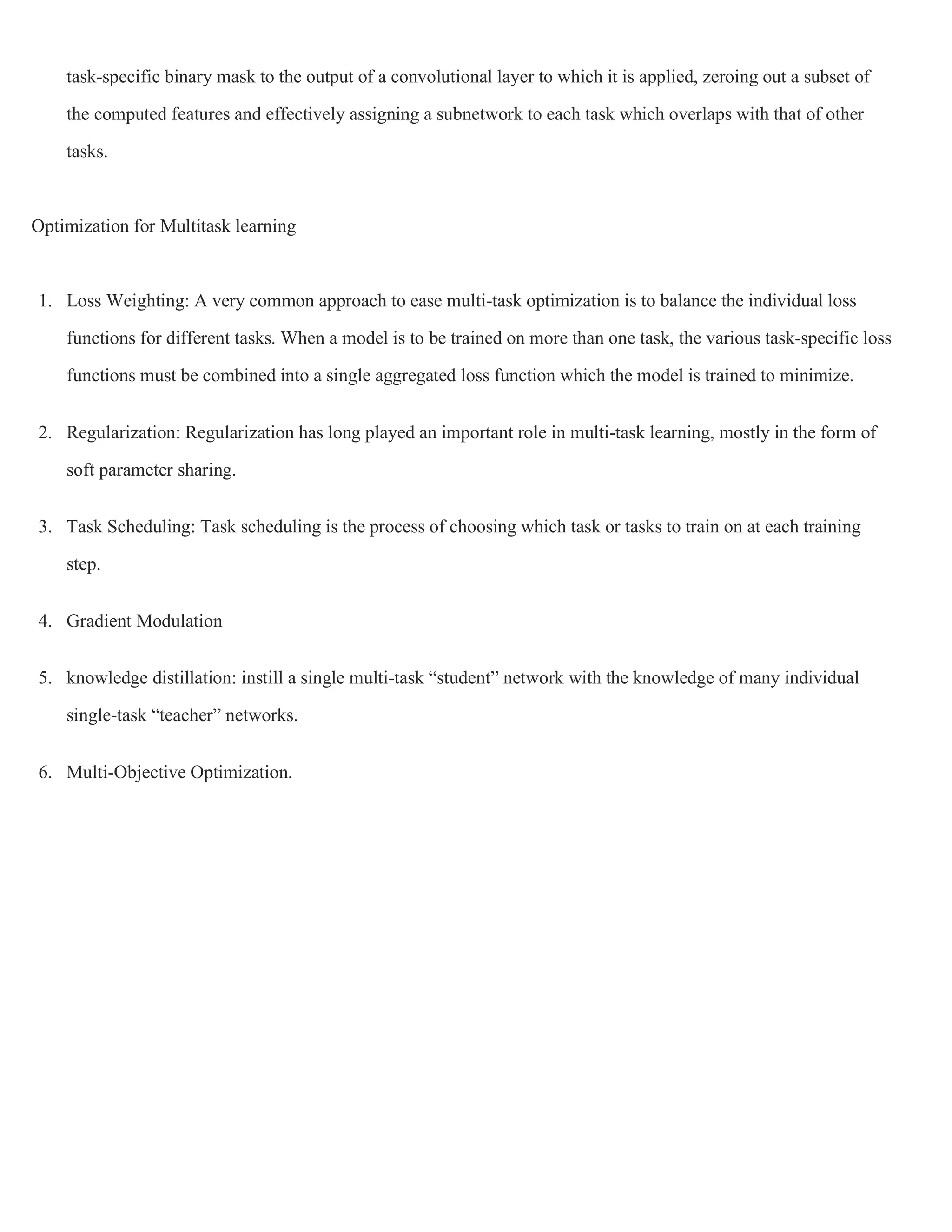 3. Optimization techniques for multi-task learning include balancing individual task losses, regularization, task scheduling, and gradient modulation.