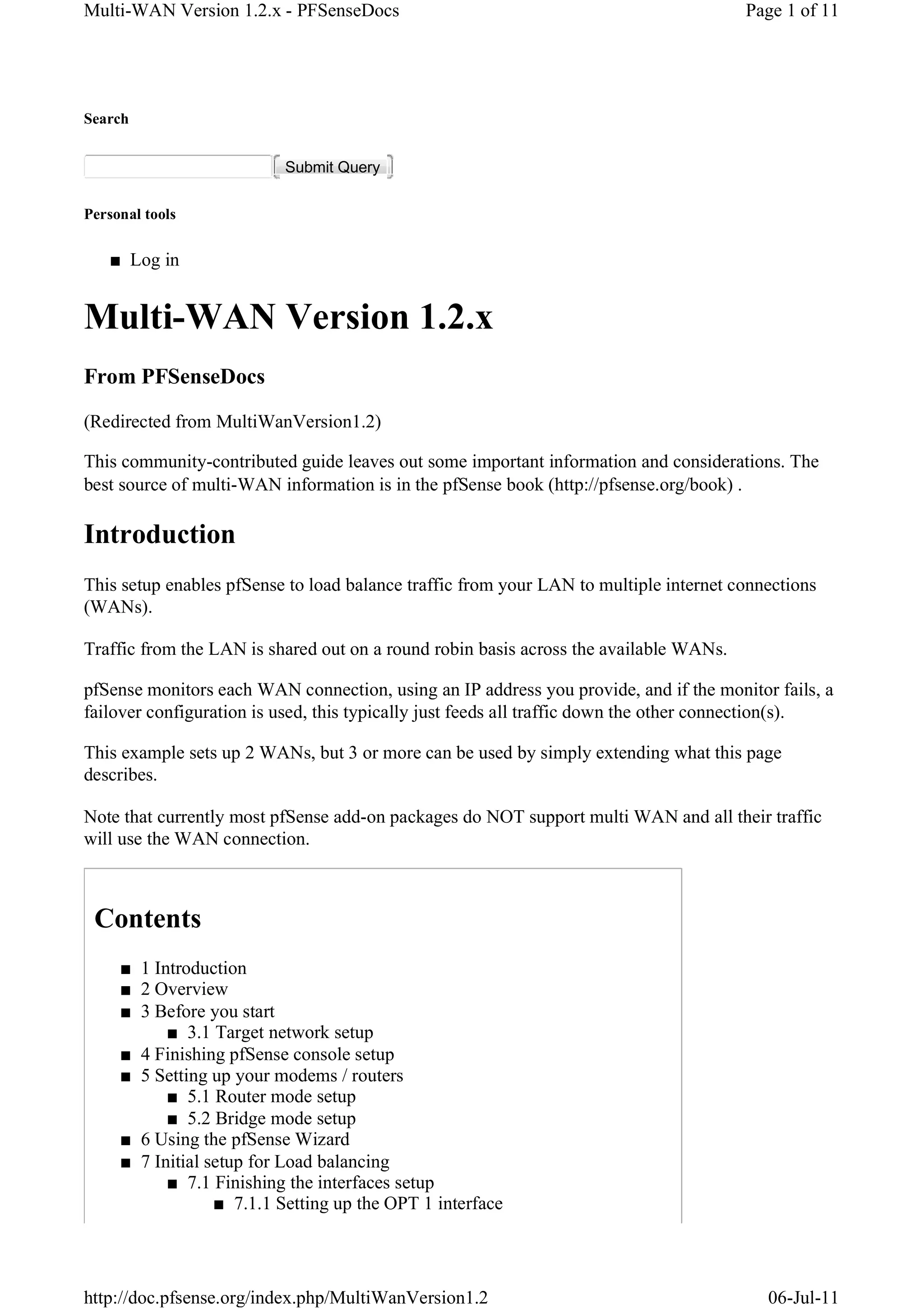 This document provides instructions for configuring multi-WAN load balancing in pfSense. It describes setting up two internet connections (WANs) and dividing traffic between them using round robin load balancing. The key steps include: