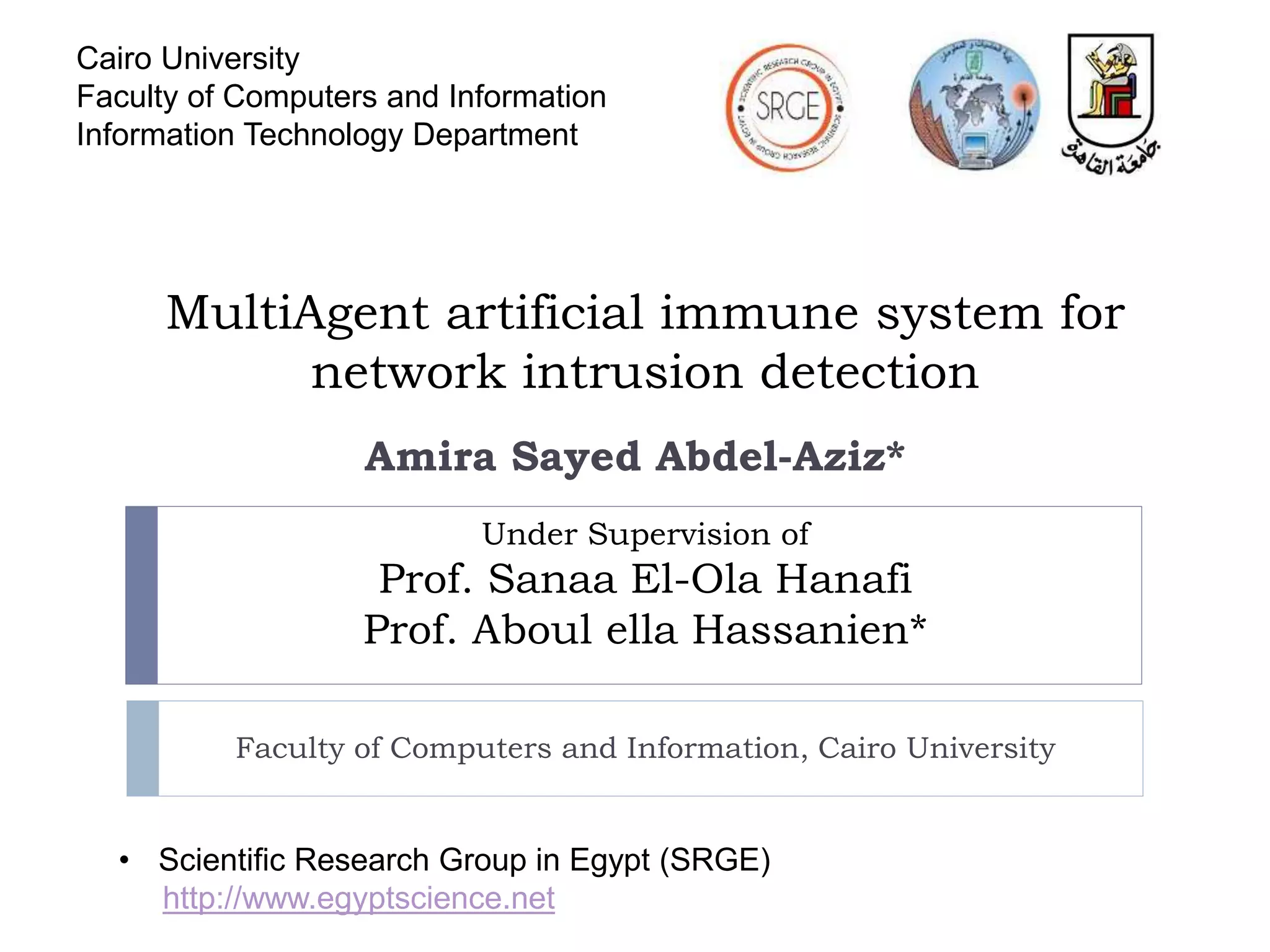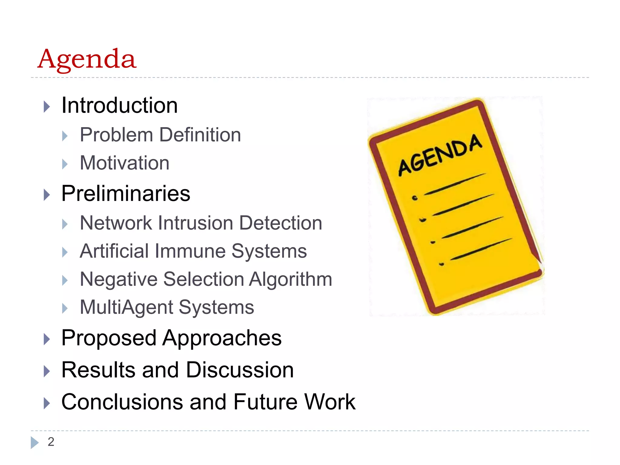 This thesis implements a multi-agent anomaly network intrusion detection system inspired by biological immunity to detect and classify network attacks. It proposes five approaches, including using a genetic algorithm to generate anomaly detectors, discretizing continuous features to create homogeneity between different feature types, and applying feature selection techniques. The approaches are evaluated on datasets like NSL-KDD to generate detectors for identifying anomalous network connections using measures like Euclidean, Minkowski, and Hamming distance. While initial results are promising, further work is needed to optimize feature selection and evaluate the approaches on additional datasets and attack types.