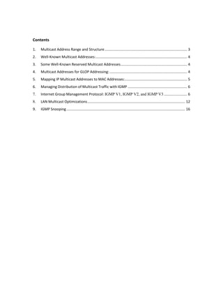 Multicast IP addresses range from 224.0.0.0 to 239.255.255.255. The document discusses well-known multicast addresses, calculating multicast MAC addresses from IP addresses, and protocols for managing multicast traffic distribution including IGMP, CGMP, IGMP snooping, and RGMP. IGMP is used by hosts to join and leave multicast groups and by routers to manage multicast traffic forwarding. Version 2 is the default and includes features like group-specific queries and shorter leave latency. CGMP and IGMP snooping allow switches to optimize multicast forwarding.