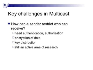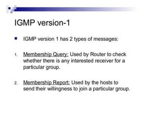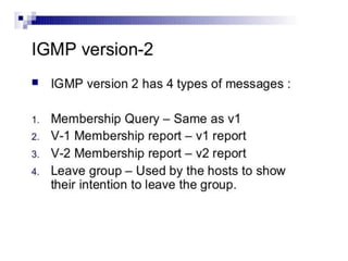 This document outlines a multicast routing project for the Alasti group which includes Allahwaryo, Junaid, Ghayas Ali, Imran Ali, Shah Jahan, and Aamir Khan. The document covers an introduction to multicast routing, why multicast is used, how the Internet Group Management Protocol (IGMP) works for versions 1 through 3, applications of multicast, advantages and disadvantages of multicast, and a conclusion on multicast being communication from one sender to multiple receivers.