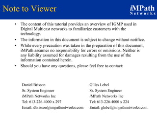This document provides an overview of how IGMP (Internet Group Management Protocol) works in digital multicast networks. IGMP allows devices like decoders to join and leave multicast groups to receive video streams from encoders. Without IGMP, multicast traffic would flood the entire network. IGMP optimizes bandwidth usage by only sending multicast streams to ports where decoders have requested them.