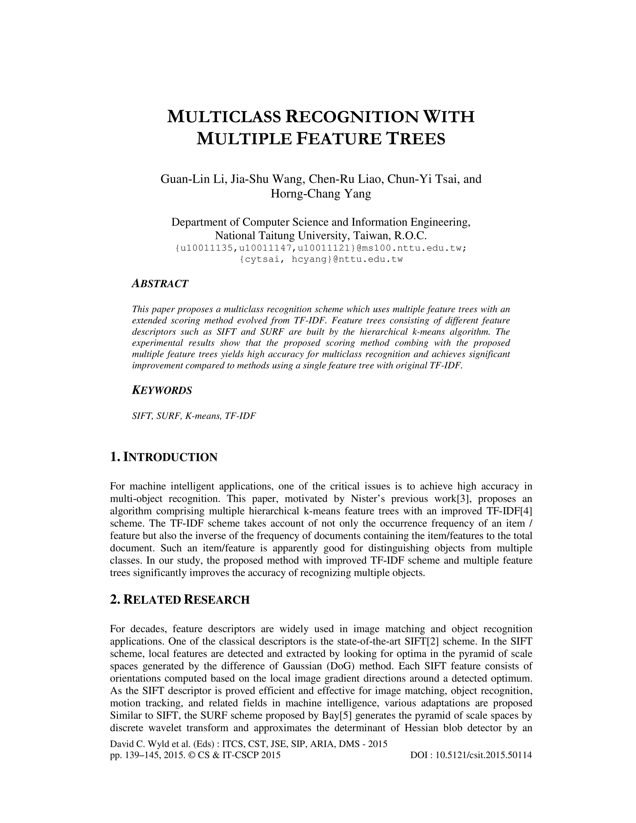 This paper presents a multiclass recognition scheme using multiple feature trees and an enhanced scoring method derived from tf-idf. The method improves image classification accuracy by utilizing hierarchical k-means clustering for building feature trees and innovative scoring techniques that consider the relevance of distinct features. Experimental results demonstrate the superiority of the proposed method over single feature tree approaches, achieving significant accuracy improvements in object recognition tasks.