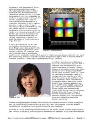 This document summarizes research being done at MIT to address challenges in developing multicore computer chips. It discusses several projects investigating ways to improve communication between cores, such as using optical connections instead of electrical ones. It also describes research into more flexible electrical connections between cores and maintaining consistency between cached copies of data stored on different cores. The document provides an overview of the challenges of multicore chip design and different approaches MIT researchers are taking to address these challenges.