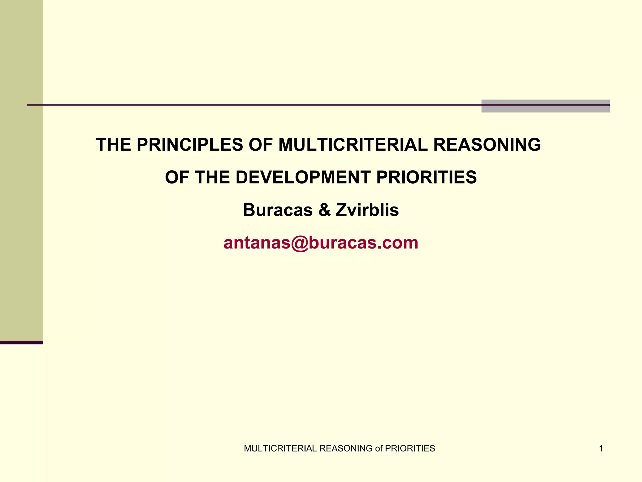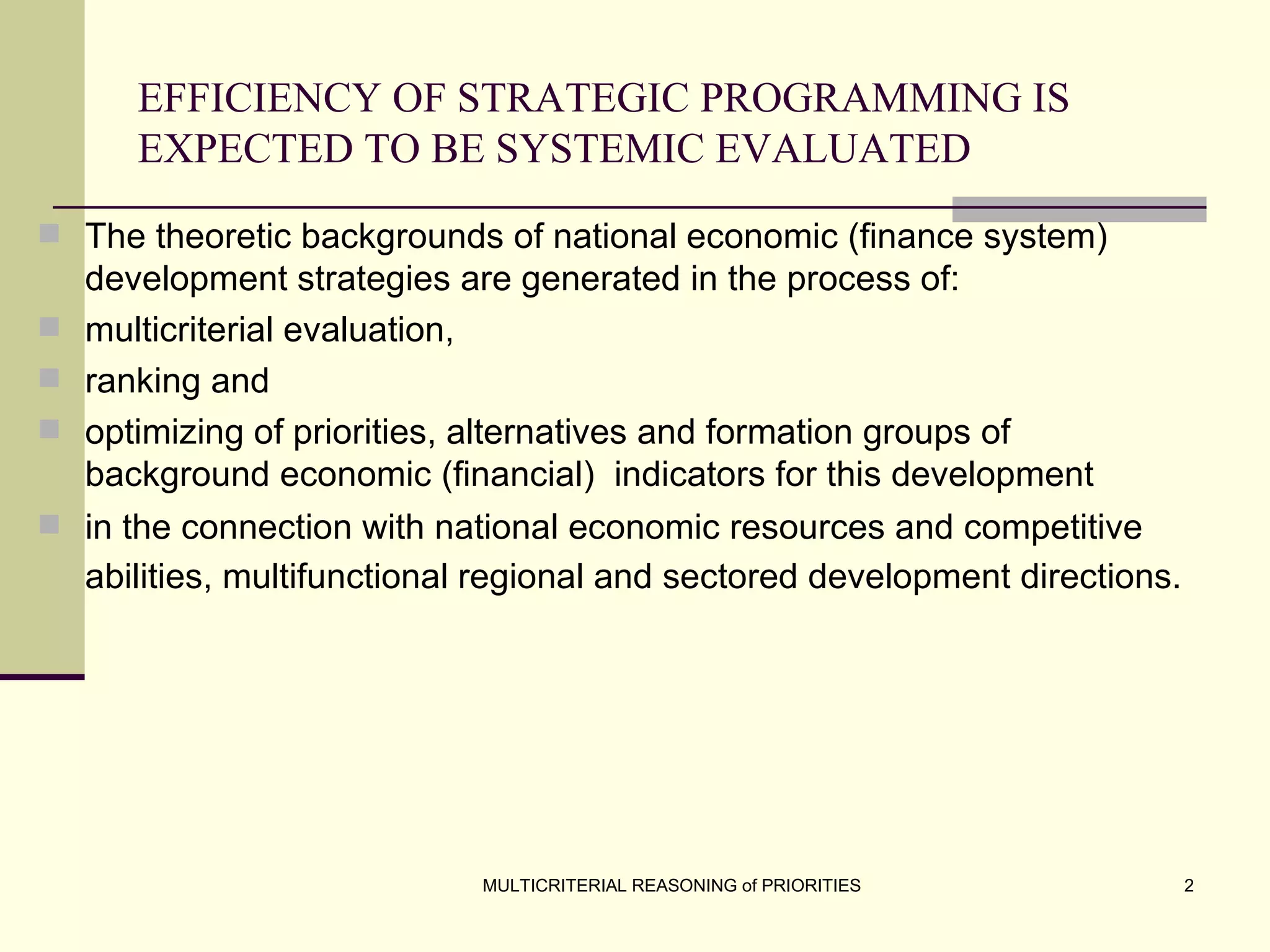 The document discusses the principles of multicriterial reasoning for developing national economic strategies, emphasizing the importance of systematic evaluation, ranking, and optimizing priorities. It outlines key stages in forming economic strategies, including SWOT analysis and the application of various evaluation methods such as AHP, SAW, and TOPSIS. Ultimately, it highlights the potential of multicriterial evaluation to enhance strategic development programs and supports the integration of these principles into management systems for more effective planning.