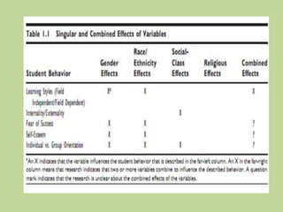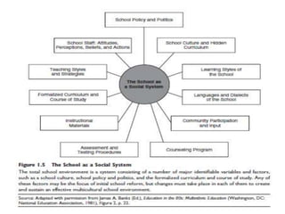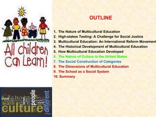 This document provides an outline for a chapter on multicultural education that discusses its key characteristics and goals. The outline includes 10 sections that will cover topics such as the nature of multicultural education, how it developed historically, the social construction of categories like race and gender, its dimensions, and the role of schools in promoting equity and justice. The overall goal of multicultural education is to ensure all students have an equal opportunity to learn by making changes to curricula, teaching approaches, school culture, and addressing issues of discrimination.
