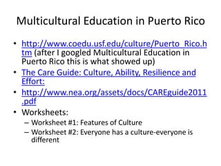 This document discusses multicultural education in Puerto Rico. It addresses the diversity found in Puerto Rico in terms of gender, sexuality, race, ethnicity, language, social class, and region. It also discusses the history of ethnic groups on the island and issues of poverty, unemployment, and educational attainment. Puerto Rico has experienced waves of migration to and from the United States due to economic conditions. Language policies in education are also covered. Cultural institutions like the Institute of Puerto Rican Culture aim to represent and promote Puerto Rican culture and identity.