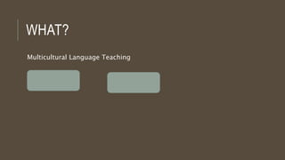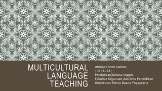 This document discusses multicultural language teaching and its importance in education. It defines multicultural education as providing equal opportunities for all students to learn regardless of their background. It outlines 13 principles for developing a multicultural approach, including helping teachers understand students' diverse backgrounds and ensuring all students have opportunities to participate. The document emphasizes that culture should be considered to understand students' attitudes and needs. It also states that multicultural language teaching can help students learn about other cultures while maintaining their own identities. Finally, it concludes that teachers need multicultural awareness to avoid biases and that multicultural approaches are important for students' cultural understanding.