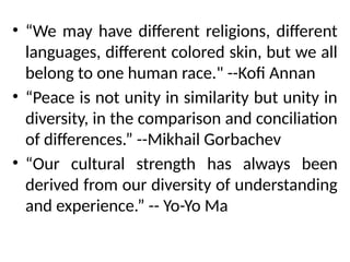 The document explores multiculturalism, emphasizing the importance of diversity, social justice, and inclusion in education, while presenting various definitions and perspectives on cultural coexistence. It discusses the implications of multiculturalism in society, including arguments for and against it, and outlines the pillars supporting a multicultural society, such as acceptance, respect, and equality. The piece also delves into theoretical frameworks, including communitarian and liberal egalitarian perspectives, advocating for the acknowledgment and protection of diverse cultural identities.