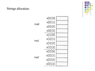 The document discusses multi-dimensional arrays, specifically two-dimensional arrays. It defines two-dimensional arrays as rows and columns that can represent tables, vectors, or matrices. It provides examples of declaring, initializing, inputting, outputting, and storing two-dimensional arrays in C code. It includes code examples for adding, transposing, and multiplying matrices using two-dimensional arrays.
