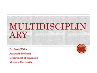 The document discusses the concept of multidisciplinary approaches in education, emphasizing the integration of multiple academic disciplines and collaboration to solve complex problems. It outlines the evolution of multidisciplinary practices, their significance in contemporary education as aligned with NEP 2020, and the flexibility they offer students in designing their own curricula. Additionally, it highlights the benefits of multidisciplinary research and teamwork in fostering innovation and developing critical skills.
