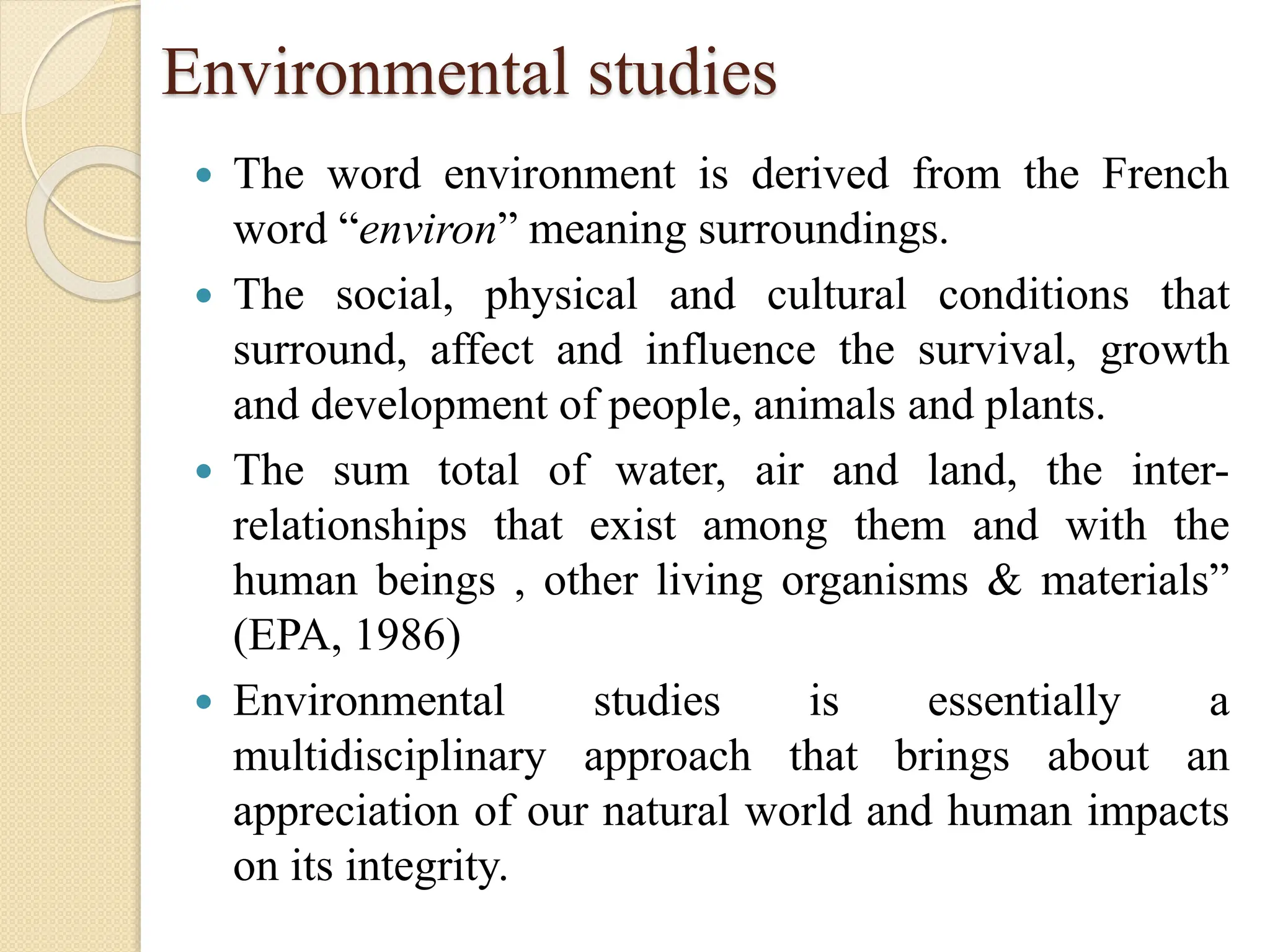 The document outlines the multidisciplinary nature of environmental studies, its definition, scope, and importance, emphasizing the interconnections between natural resources, ecology, and human impacts. It covers various aspects such as resource management, pollution control, social issues, and emerging career opportunities in environmental science and advocacy. Additionally, it discusses components of the environment, types of natural resources, and provides a calendar of significant environmental observances.