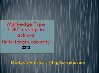 This document discusses multi-edge type (MET) low-density parity-check (LDPC) codes. MET-LDPC codes use defined protograph structures and density evolution to optimize thresholds and achieve capacity. Puncturing nodes in the protograph changes the influence of trapping sets and can provide cycle-canceling properties to simplify code design and lower error floors. Several examples of MET-LDPC protographs that improve thresholds through puncturing and cascading techniques are presented. The document predicts that MET-LDPC codes will revolutionize channel coding in the next 10 years and become a dominant error correction solution.