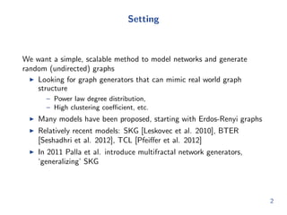 The document presents methods for modeling large networks using multifractal network generators (MFNG), focusing on scalability and estimation. It outlines a theoretical framework that allows for efficient graph generation and parameter fitting through method of moments estimation, demonstrating effectiveness with empirical data from synthetic and real-world networks. The authors also discuss challenges and solutions for fast sampling and estimating network structures.