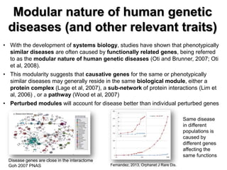 This document discusses the modular nature of human genetic diseases and how disease genes often reside in the same biological module or pathway. It then discusses how most personalized treatments are based on single-gene biomarkers, with some exceptions like MammaPrint which uses a multigenic biomarker. The rest of the document discusses challenges in defining functional modules and modeling their behavior, and how this could lead to more realistic "actionable pathway models" and a transition to true precision medicine.