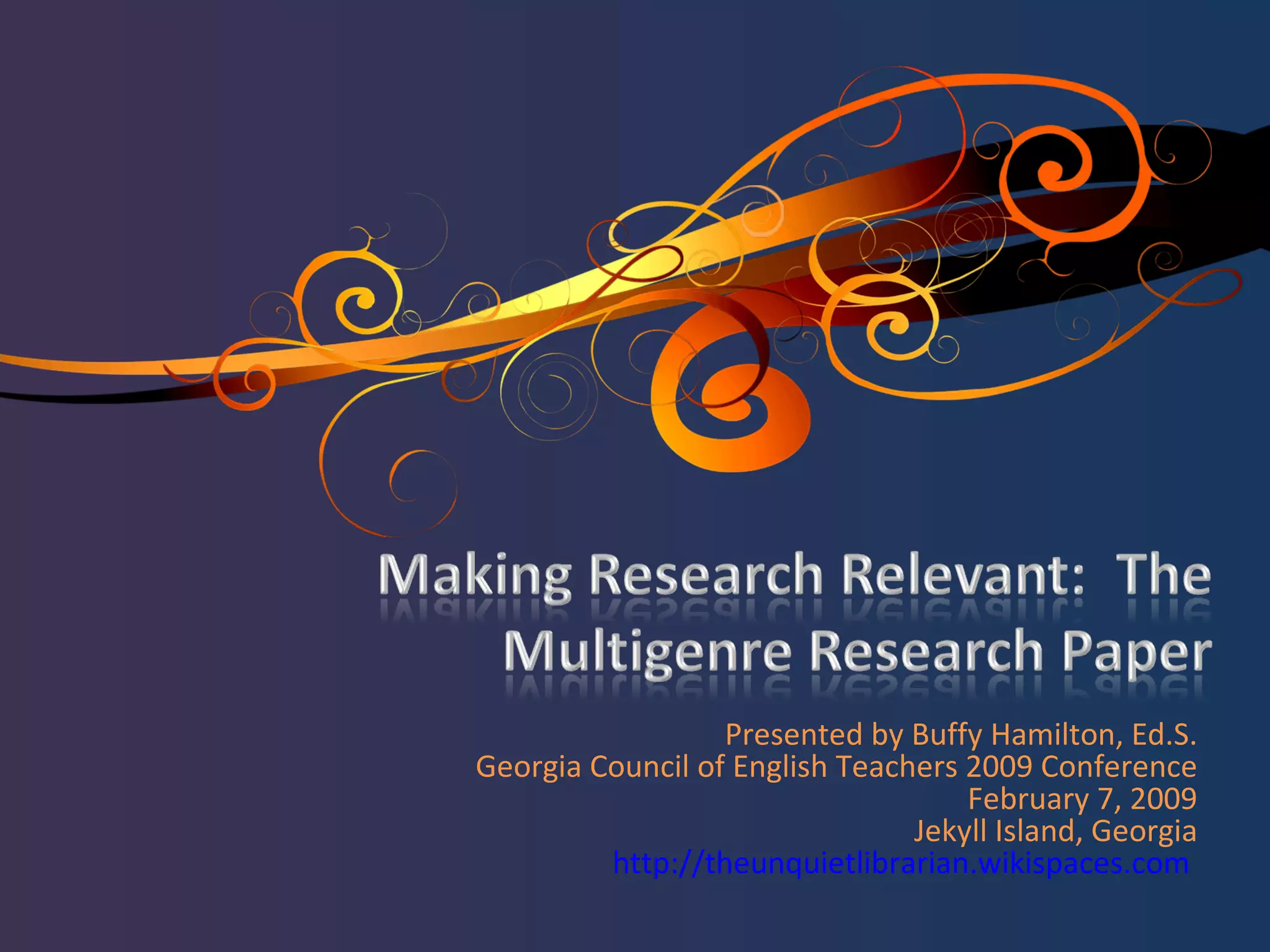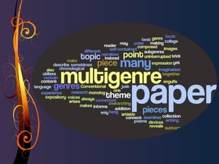 The document discusses the concept of a multigenre research essay, which combines various genres to explore a research topic creatively while engaging students in metacognition. It emphasizes the benefits of using alternative genres and provides tips for successfully implementing such projects in educational settings, including collaboration with librarians. The document also outlines structural elements of a multigenre paper and introduces the concept of 'repetend' to unify the different sections.