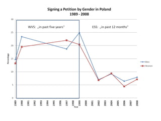 The document discusses factors that influence women's political participation at both the individual and country level. It examines data from the European Social Survey on political participation rates of men and women in various European countries. It also discusses two women's organizations in Poland, the Women's Parliamentary Group and Women's Congress, that aim to increase gender equality and female representation in Polish politics. Finally, it quotes a feminist activist saying that while women's emancipation has increased in other areas, politically Poland has lost out over the last 20 years by not addressing issues like abortion rights.