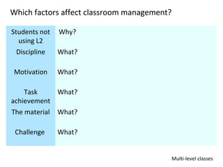 The document discusses strategies for managing multi-level classrooms. It provides examples of activities that encourage collaboration between students of different abilities, such as assigning roles in group work and games that require students to build on each other's responses. It also suggests ways to challenge students of varying levels, like giving advanced students extra tasks to keep them engaged. The document emphasizes principles like variety, pace, interest, and individualization to meet the needs of all students in a multi-level classroom.