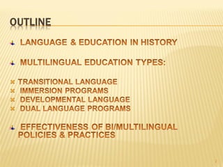The document discusses bilingual and multilingual education around the world, including the use of minority and indigenous languages in schools. It examines different models of bilingual education such as immersion programs, transitional bilingual education, and maintenance bilingual education. Key issues addressed include the role of language in education, cultural and linguistic rights, and how schools can balance global and local languages.