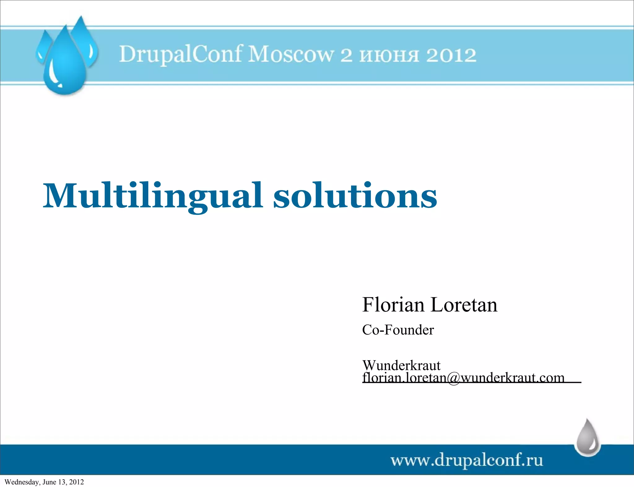 This document discusses building multilingual Drupal websites. It covers questions to consider like what languages to support and who will do translations. It then outlines the steps to set up languages, translate the user interface, content, and other elements. These include installing languages, translating variables, nodes, menus and more using modules like Entity Translation. It also discusses extending functionality with tools like the Localization Update.
