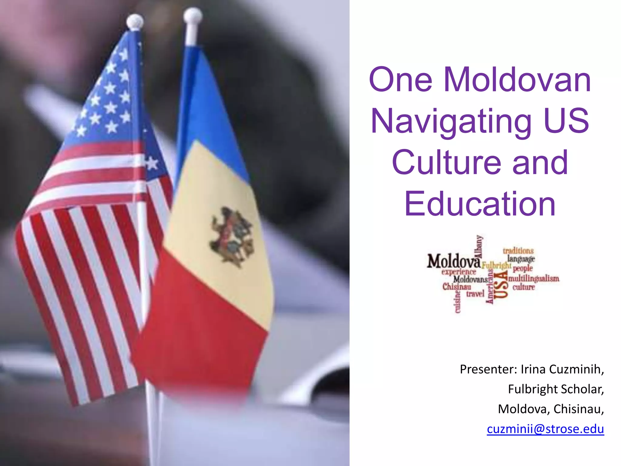 This document provides an overview of the presenter's background navigating between the cultures and education systems of Moldova and the United States. The presenter is fluent in three languages and was educated in Moldova, having taught English for five years at the State Pedagogical University "I. Creanga". They note that Russian and Romanian are the official languages in Moldova and that code-switching between the two is common, with some speakers mixing the languages freely in conversation. The presenter is participating in the Fulbright Program, which has supported over 114,000 Americans and 186,000 international participants in cultural exchange over the past 60 years.