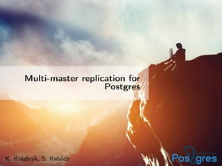 Документ рассматривает реализацию мульти-мастер репликации в PostgreSQL, акцентируя внимание на транзакциях, уровнях изоляции и распределённых транзакциях. Описываются особенности работы с версиями баз данных, подходы к атомарности, обработке конфликтов и управления состоянием транзакций. Также представлены практические аспекты настройки и тестирования системы, включая вопросы, касающиеся совместимости и производительности.