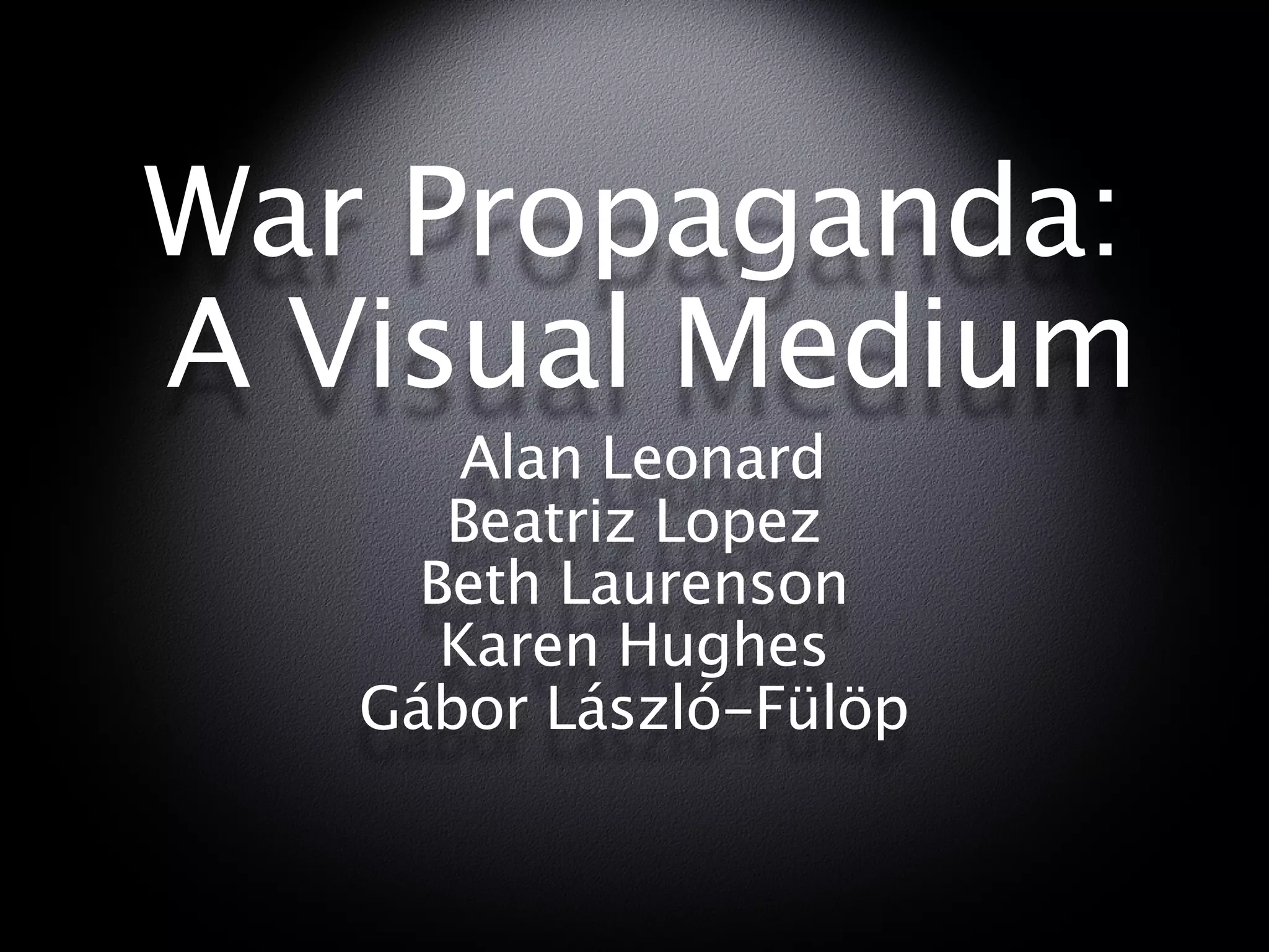 The document provides an overview of the history and techniques of war propaganda from ancient times to modern conflicts. It discusses how propaganda evolved from primarily using posters, newspapers, radio, and film in WWI and WWII to incorporating new media like television and the internet in more recent wars. The document outlines some common propaganda techniques such as using bandwagon appeals, testimonials, repetition, and emotional words/images. It then analyzes the use of propaganda in several specific conflicts from WWI to the War on Terror.