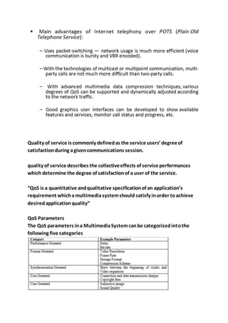 Internet telephony refers to voice, facsimile, and voice messaging applications that are transmitted over the Internet instead of the public telephone network. The basic process involves converting an analog voice signal to digital format and compressing it into Internet packets for transmission. More technically, it is the real-time delivery of voice and other multimedia data types between two or more parties using Internet protocols to control delivery. Common terms for this include Internet telephony, IP telephony, and voice-over-IP. Quality of service parameters like delay, bit rate, packet loss, jitter, and data quality must be considered to ensure desired application quality for users.