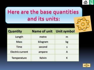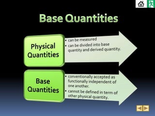 2. It defines derived quantities as those derived from base quantities through multiplication or division, and provides examples of speed being derived from distance and time. Prefixes are used to represent very small and large SI units.