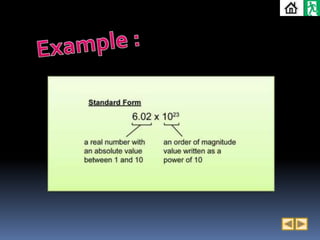 3. Scientific notation, also called standard index notation, is used to write very small or large numbers as the product of a number between 1 and 10 and a power of 10, making the numbers neat and easy to read.