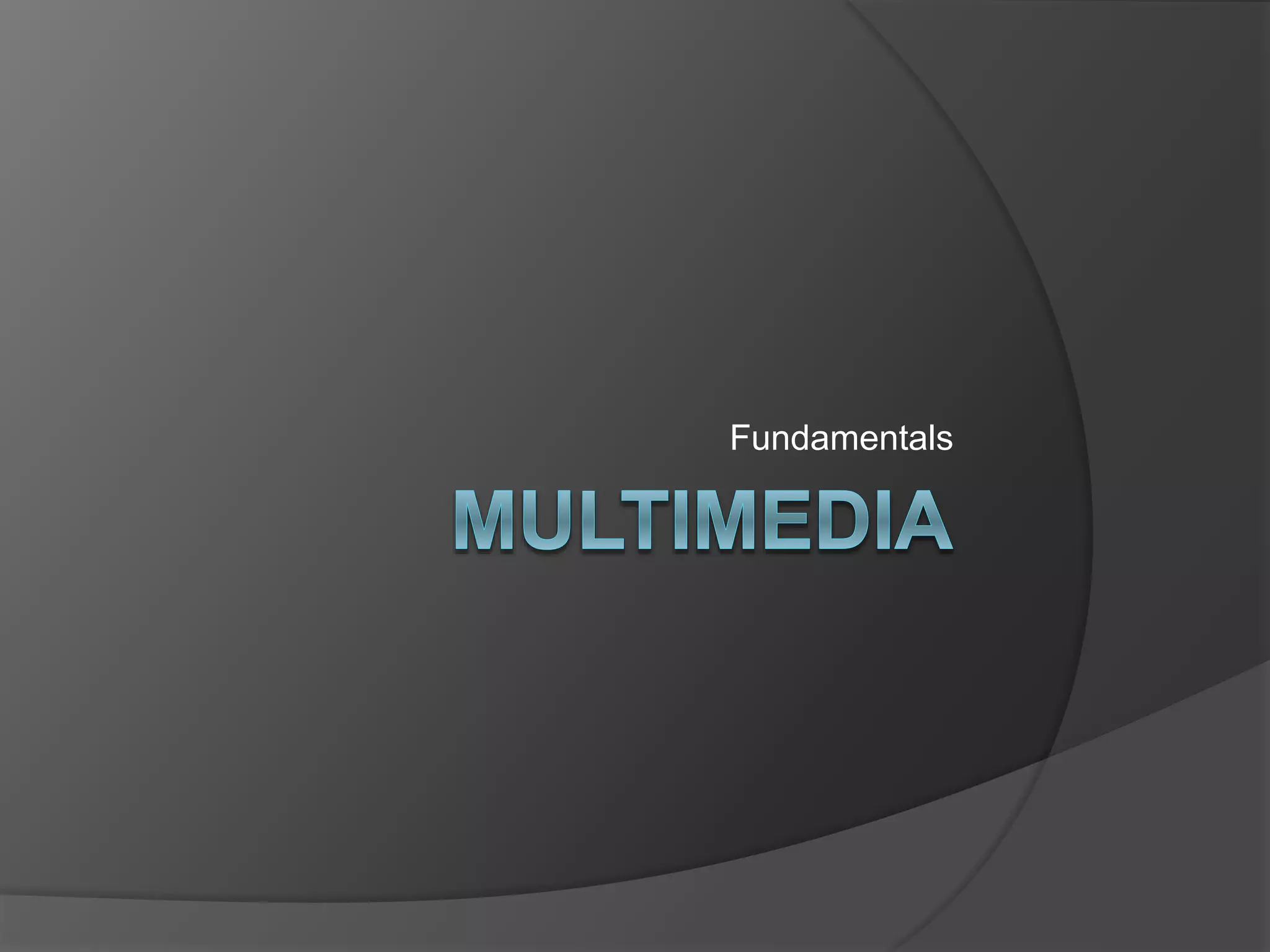 Multimedia is defined as the integration of up to six different media types, including text, graphics, audio, and video, delivered electronically. It can include linear media like live streams as well as non-linear media like edited TV shows and movies. The different media types used in multimedia include text, images, graphics, audio, video, and animations. Graphics can be raster graphics made of pixels or vector graphics represented mathematically. Audio is sound energy that travels in waves, while video combines audio and a series of still frames that create the illusion of motion when displayed rapidly.