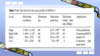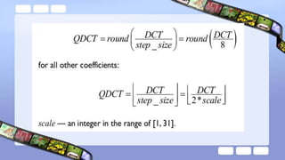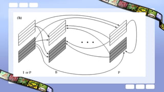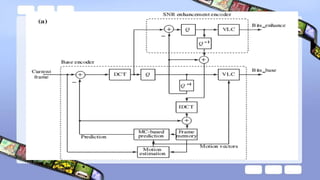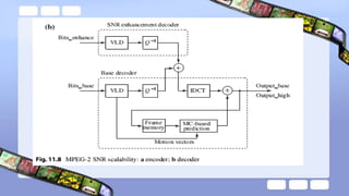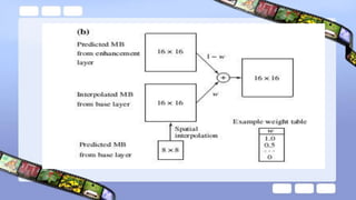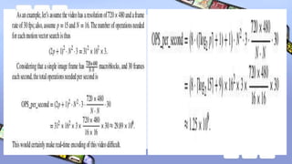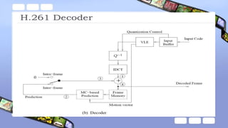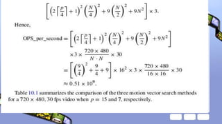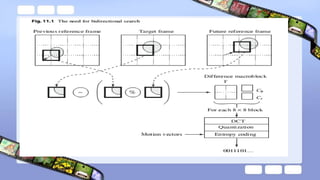 The document discusses video compression techniques, emphasizing predictive coding based on motion estimation and compensation to exploit temporal redundancy between frames. It details the steps involved in motion vector search and various search algorithms, including sequential, logarithmic, and hierarchical search methods, as well as the coding of intra-frames and inter-frames in standards like H.261 and H.263. Additionally, it explains how advanced coding options in H.263 improve coding efficiency and flexibility for low-bitrate video transmission.