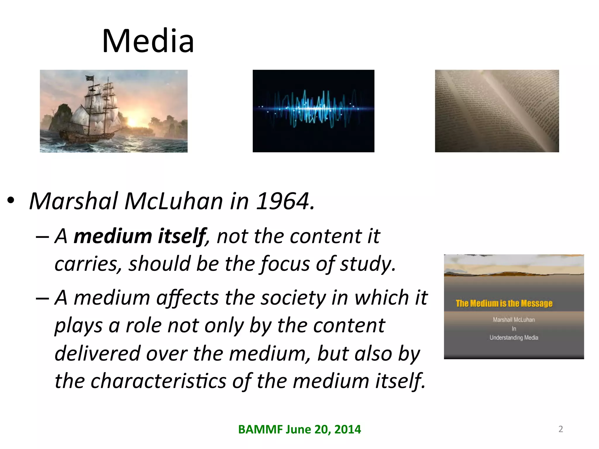 The document discusses the evolution of media and digital technology, emphasizing the importance of studying the medium itself, as articulated by Marshall McLuhan. It highlights the role of big data and multimedia in communications and computing, as well as their impact on storytelling and individual experiences. Additionally, it addresses the challenges and opportunities that arise from the integration of various data sources in understanding and addressing complex societal needs.