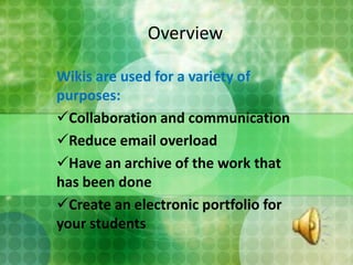 This document provides instructions for setting up and using a wiki to actively engage students and communicate with parents. It outlines 10 steps for creating a wiki through Wikispaces, including making an account, creating pages, editing pages, adding discussions, viewing page histories, and enabling email notifications. The overall goals of using a wiki are for collaboration, reducing email overload, creating an archive of work, and building electronic student portfolios.