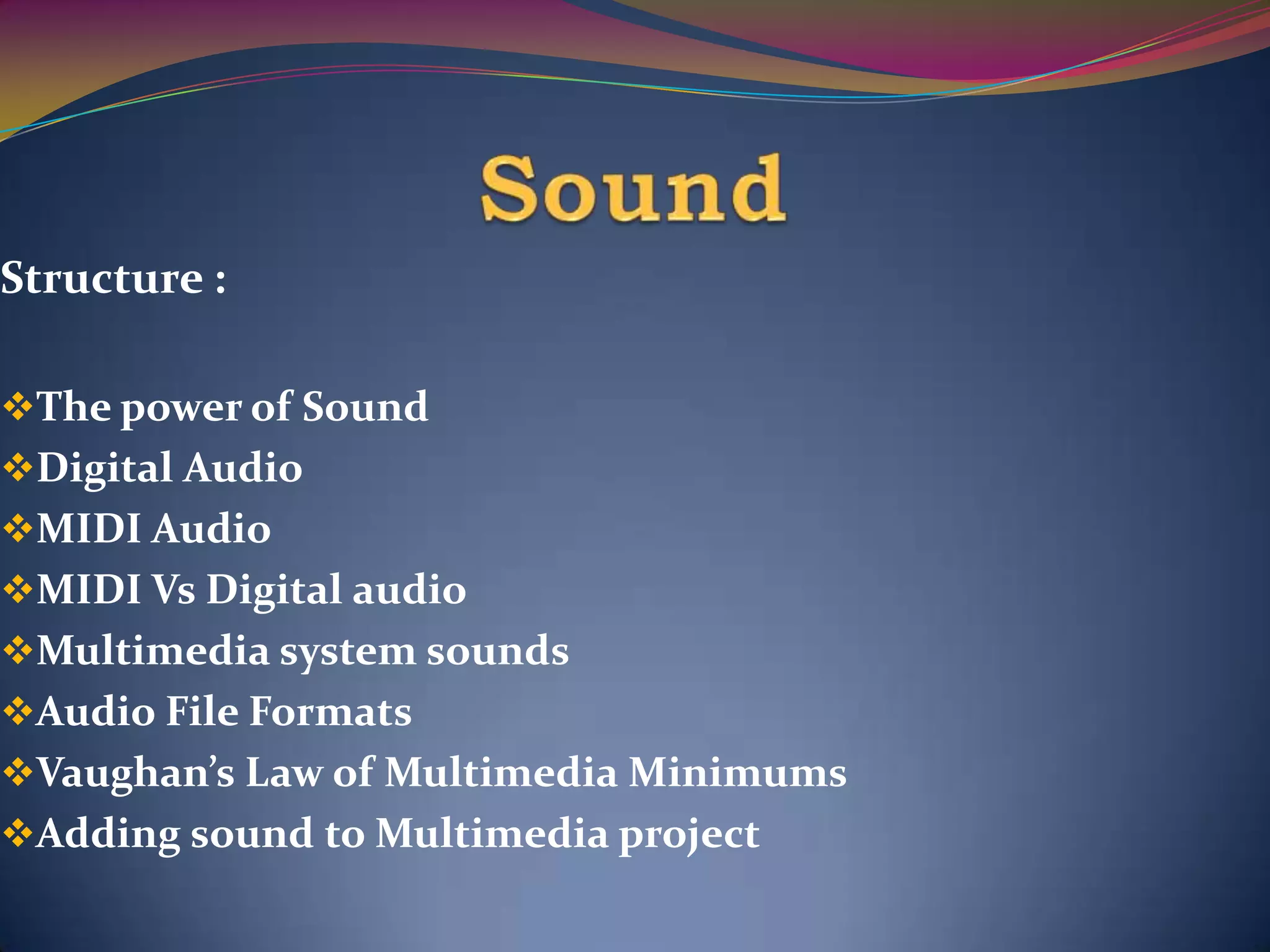 The document discusses adding sound to multimedia projects. It covers digital audio, MIDI audio, audio file formats, and basic sound editing. Some key points: