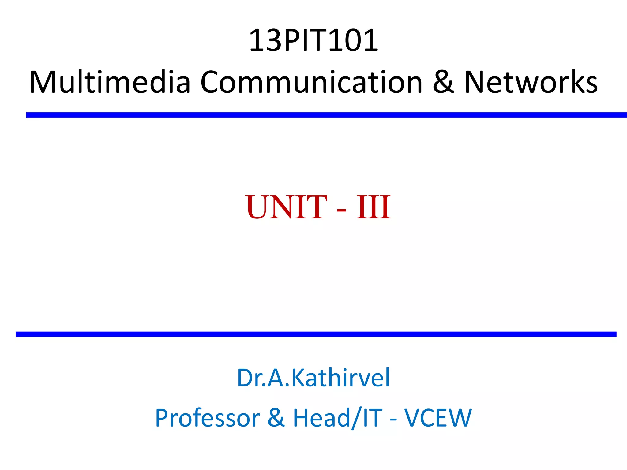 The document discusses quality of service (QoS) in multimedia communication networks, including QoS parameters and classes, deterministic and predictive QoS parameters, guaranteed and best effort QoS, QoS-aware service models, scheduling and policing mechanisms like priority scheduling and weighted fair queueing, and QoS architectures like Integrated Services and Differentiated Services.