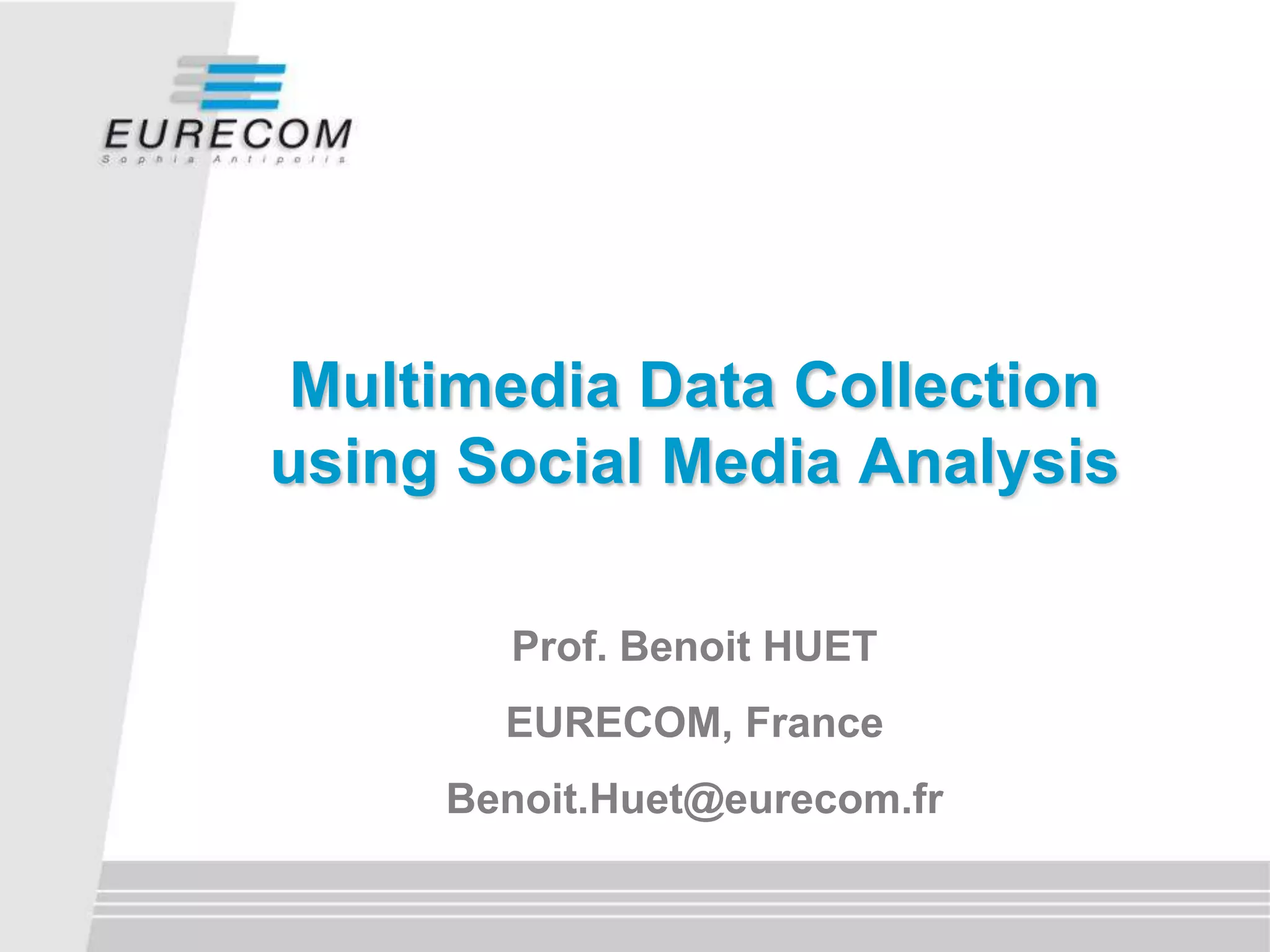 Prof. Benoit Huet's keynote discusses the evolution of multimedia data collection through social media analysis, highlighting the transition from small-scale datasets in the 1990s to large-scale collections in recent years. The presentation covers techniques for social event detection and media mining, emphasizing the integration of machine tags and user-generated content for accurate event identification. Huet concludes that efficient social event detection can be achieved by monitoring media uploads at specific locations over time.