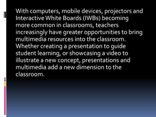 This document discusses various multimedia tools that can be integrated into the classroom, including tools for creating comics, digital storytelling, presentations, e-books, and speaking avatars. It provides the websites and brief descriptions of popular comic creation tools like Kerpoof and Toondoo that allow students to create digital comics. It also outlines digital storytelling tools such as StoryBird and VoiceThread that enable students to incorporate visuals and audio into multimedia presentations. Additionally, it mentions presentation software like Prezi, as well as e-book creation platforms like Book Builder and Bookemon. Finally, it discusses Voki, a tool for developing personalized speaking avatars.