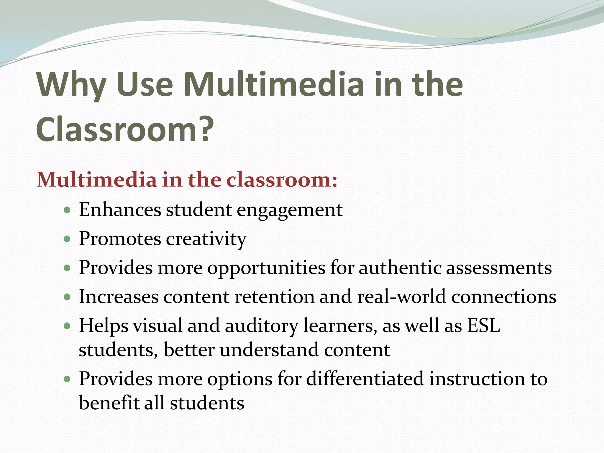 The document discusses the benefits of using multimedia in the classroom, including enhancing student engagement, promoting creativity, and helping different types of learners understand content. It describes the presenter's experience using various multimedia tools for a course, such as Animoto for easy video creation. The presenter discusses challenges like ensuring appropriate content and managing time, as well as successes like improved skills with Windows Movie Maker. Overall, the presenter was glad to learn new multimedia tools and plans to continue exploring their use in teaching.