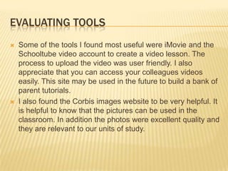 The document summarizes Julie Hartman's final presentation on using multimedia tools in the classroom. It evaluates tools like iMovie and Schooltube that were useful for creating video lessons. It discusses the successes of collaborating with colleagues to develop online projects and podcasts that will benefit students. It also addresses the challenges of overwhelming resources and deciding which projects support the curriculum. It reflects on using Moodle for adult education but not for young students, and how online learning can help teach and reinforce ideas for students and parents.