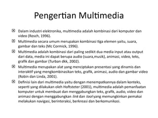 Dokumen ini menjelaskan tentang multimedia sebagai kombinasi dari berbagai media seperti suara, gambar, dan teks, serta sejarah, jenis, dan pengembangan bidang multimedia. Manfaat multimedia mencakup penggunaannya dalam periklanan, pendidikan, dan bisnis, dengan dampak signifikan seperti mengubah cara kerja dan belajar. Sistem multimedia dapat dikategorikan menjadi sistem standalone dan berbasis jaringan, dan masa depan multimedia tergantung pada teknologi dan profesi yang terus berkembang dalam bidang ini.