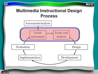 The document outlines the steps in a multimedia instructional design process, including needs assessment, front-end analysis, and instructional design phases. Needs assessment determines goals, priorities, and discrepancies. Front-end analysis provides detailed information through audience analysis, technology analysis, task analysis, and other methods. Instructional design phases include analysis of learners, content, and delivery methods to develop effective multimedia instruction.