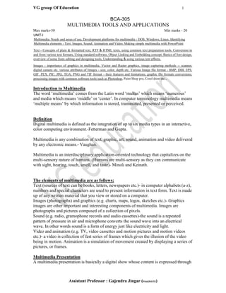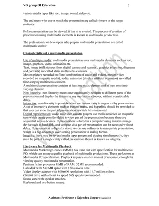 The document provides a comprehensive overview of multimedia tools and applications, detailing their various elements, characteristics, and production processes. It also covers the hardware and software requirements for multimedia presentations, explores the needs and usage of multimedia across different fields, and outlines steps for creating effective multimedia presentations. Furthermore, it discusses development platforms such as DOS, Windows, and Linux relevant to multimedia production.