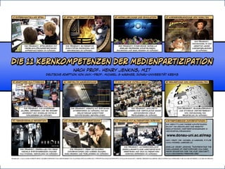 This document provides examples of different types of multimedia content created and shared online, including speedruns and multiplayer gameplay videos from YouTube, machinima videos set in World of Warcraft and Second Life from YouTube and Vimeo, fan fiction websites, and examples of flashmobs from YouTube. It also mentions learning.