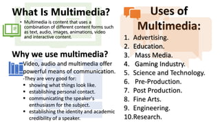 Multimedia combines different forms of content like text, audio, images, video and interactive elements. It is used in advertising, education, media, gaming, science, arts and more. Video, audio and multimedia are effective communication tools for showing concepts, connecting with audiences, and establishing credibility. When creating multimedia presentations, best practices include using words and graphics together, keeping images relevant, presenting text as audio, allowing interactivity, and designing for self-running or navigable formats like slideshows or video. While multimedia increases learning and engagement, it also has costs and requires proper hardware and configuration to implement.
