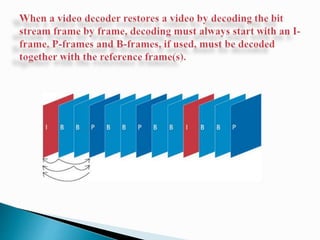 Video compression reduces and removes redundant video data so digital video files can be efficiently transmitted and stored. Uncompressed video takes up huge amounts of data, for example over 1 GB/s for high definition TV. Compression uses algorithms to encode video into a smaller compressed file, then decode it back into a similar quality video. Popular standards like MPEG-4 and H.264 use techniques like comparing frames and only coding changed pixels to greatly reduce file sizes while maintaining quality. Frames can be intra-frames that standalone or inter-frames that reference other frames, allowing different levels of compression.
