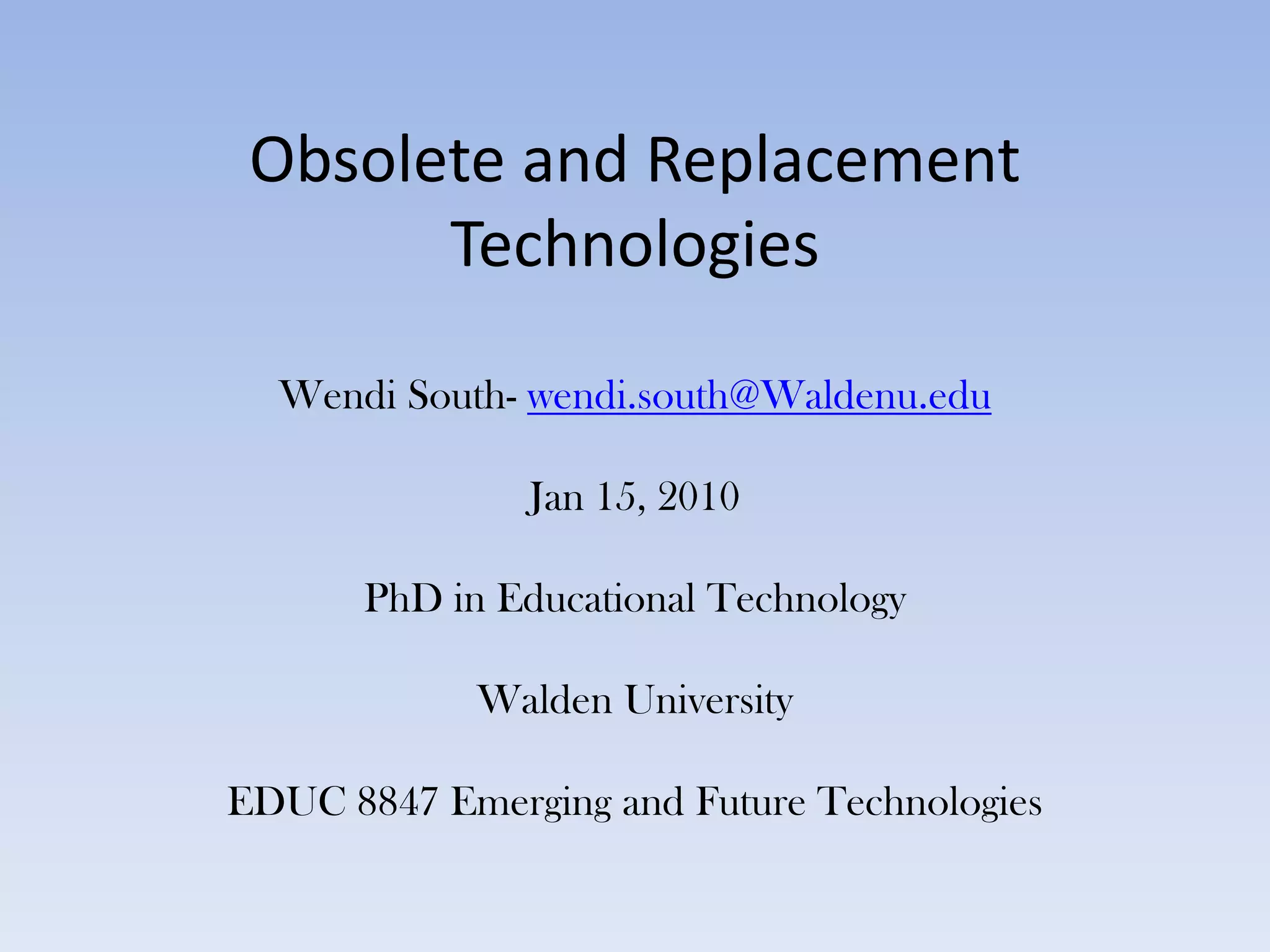 The document discusses obsolete and replacement technologies used in schools, specifically opaque projectors and overhead projectors. It provides background on how each technology was used and the reasons they became obsolete. Opaque projectors were replaced by overhead projectors due to high replacement bulb costs, limited space, and bulkiness. While overhead projectors saw widespread use in the 1990s and can still be found, they are now being replaced by document cameras and interactive whiteboards coupled with projectors. Interviews with a teacher and technology coordinator provide further context on technology adoption in schools.